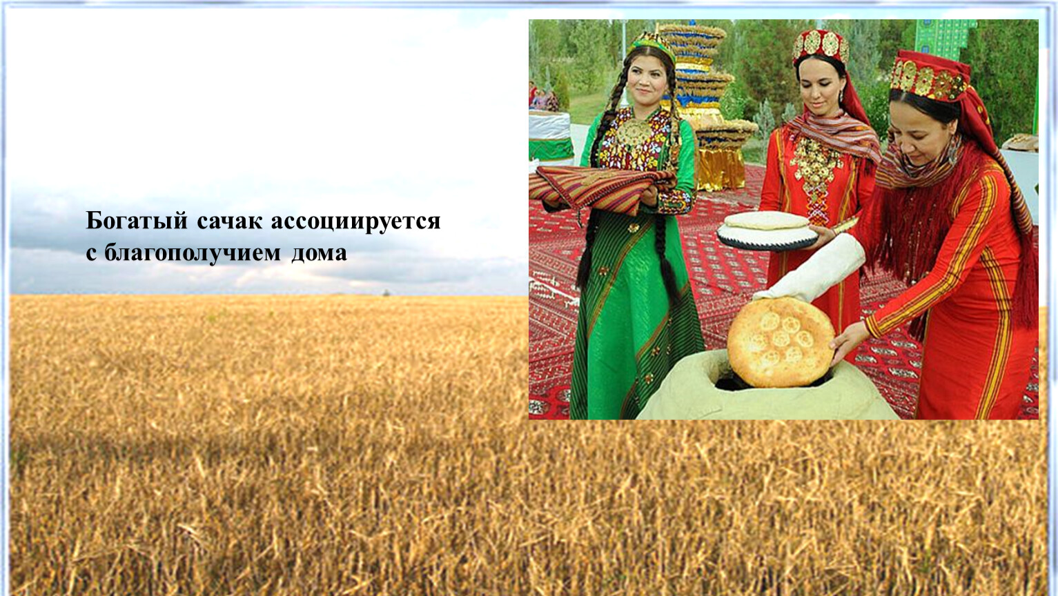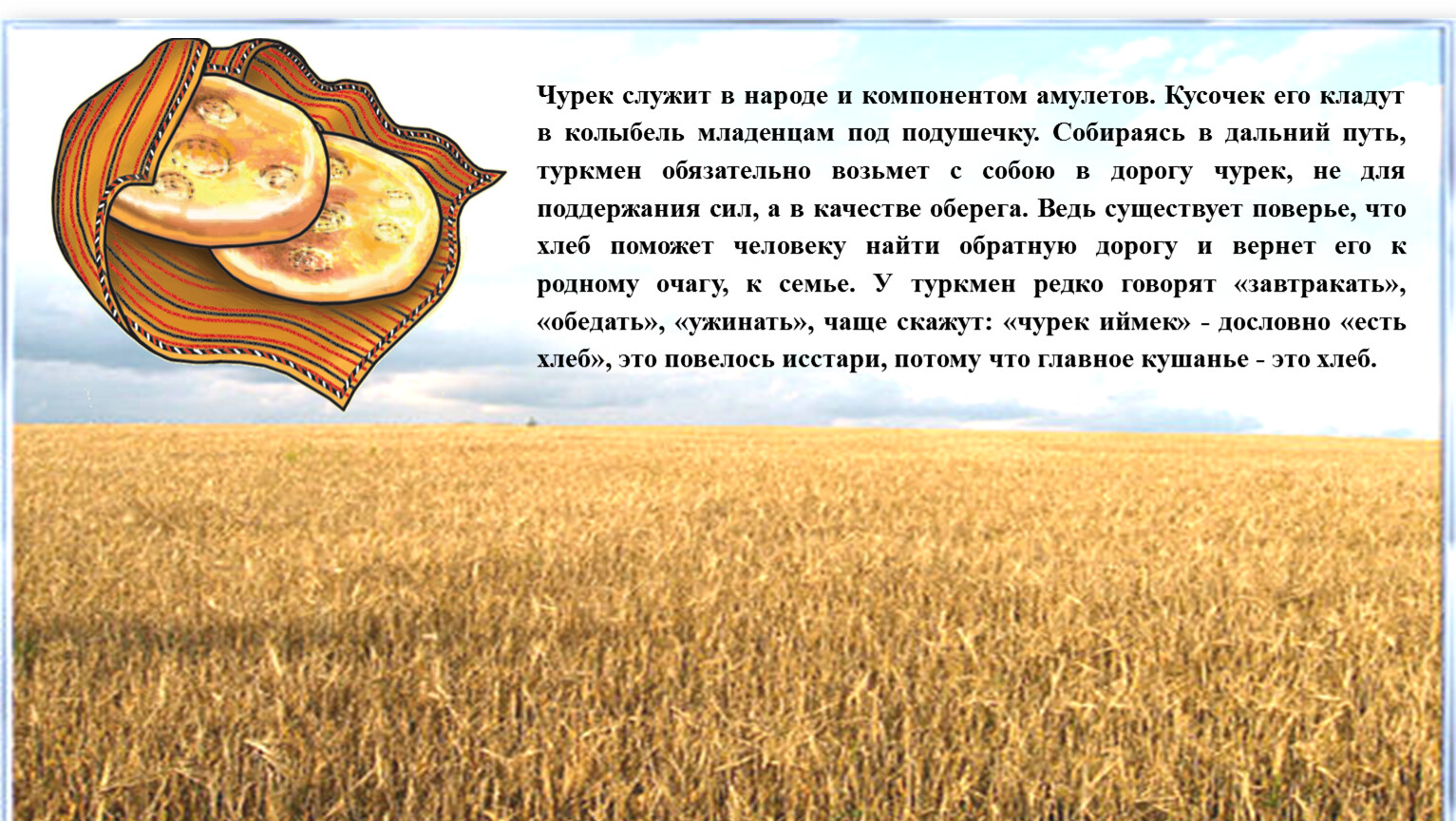 Бережное отношение к хлебу является одной из главных духовных ценностей человека. Поэтому у туркмен, как и у многих народов существует много обычаев, связанных с уважительным отношением к хлебу. Ронять хлебные крошки, наступать на хлеб, бросаться им считалось грехом. Из чувства уважения туркмены никогда не кладут чурек вниз «лицом», ножом не режут, а отламывают. В старину детям не разрешали брать чурек из сачака, это делали взрослые. Хлебом и солью встречают дорогих и любимых людей. Переезжают в новый дом также с хлебом и солью.