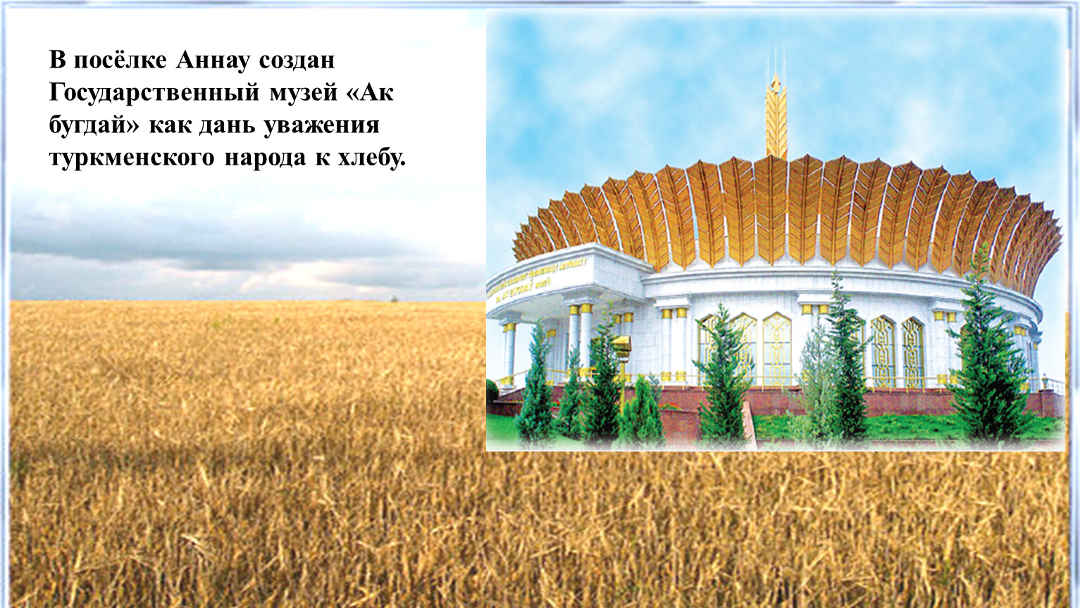 В посёлке Аннау создан Государственный музей «Ак бугдай» как дань уважения туркменского народа к хлебу.