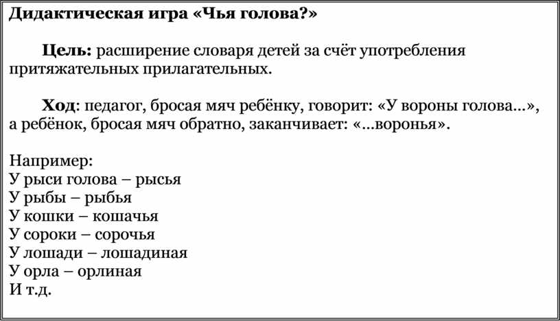 Ход: педагог, бросая мяч ребёнку, говорит: «У вороны голова…», а ребёнок, бросая мяч обратно, заканчивает: «…воронья».
