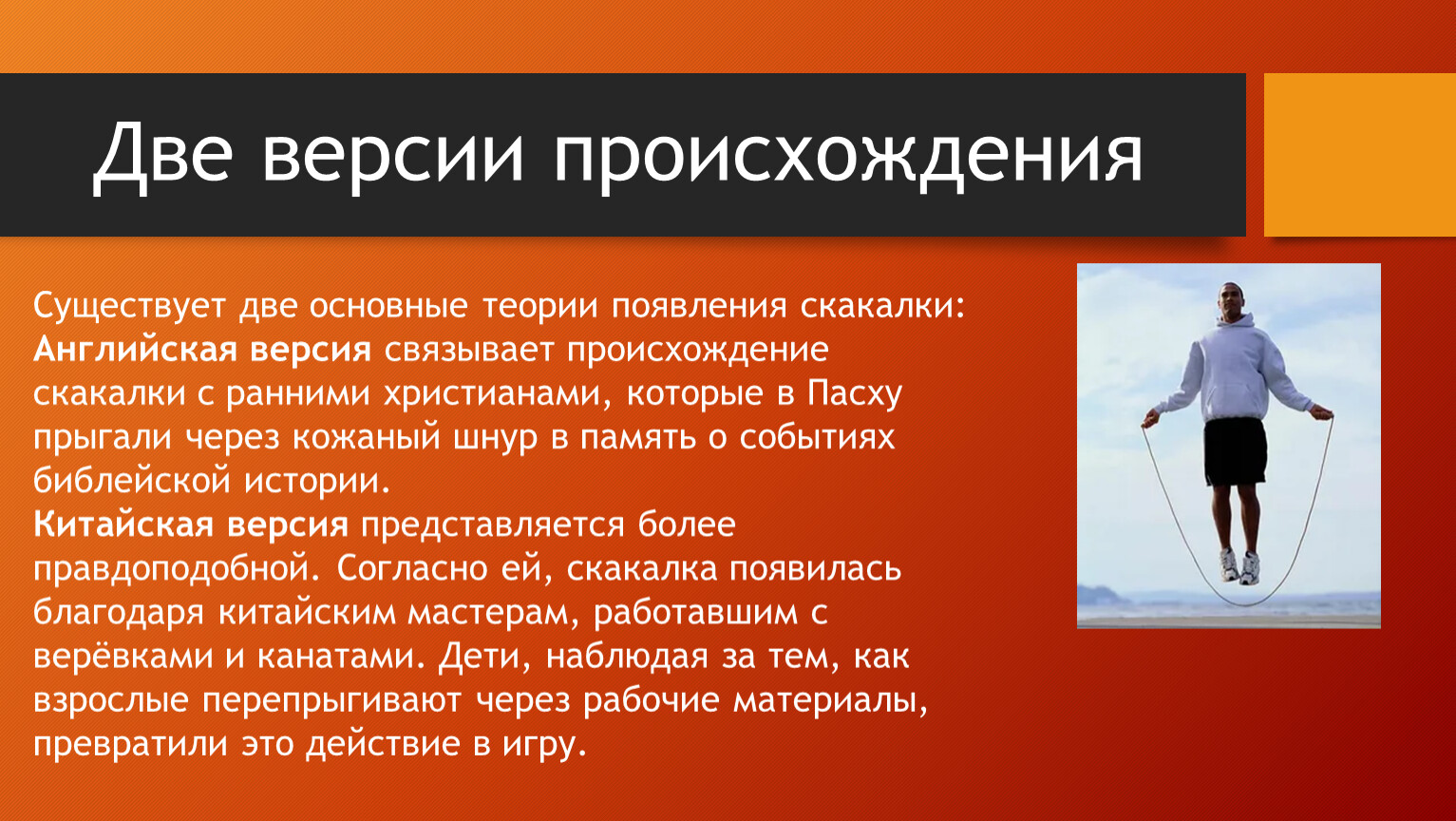 Китайская версия представляется более правдоподобной. Согласно ей, скакалка появилась благодаря китайским мастерам, работавшим с верёвками и канатами. Дети, наблюдая за тем, как взрослые перепрыгивают через рабочие материалы, превратили это действие в игру.