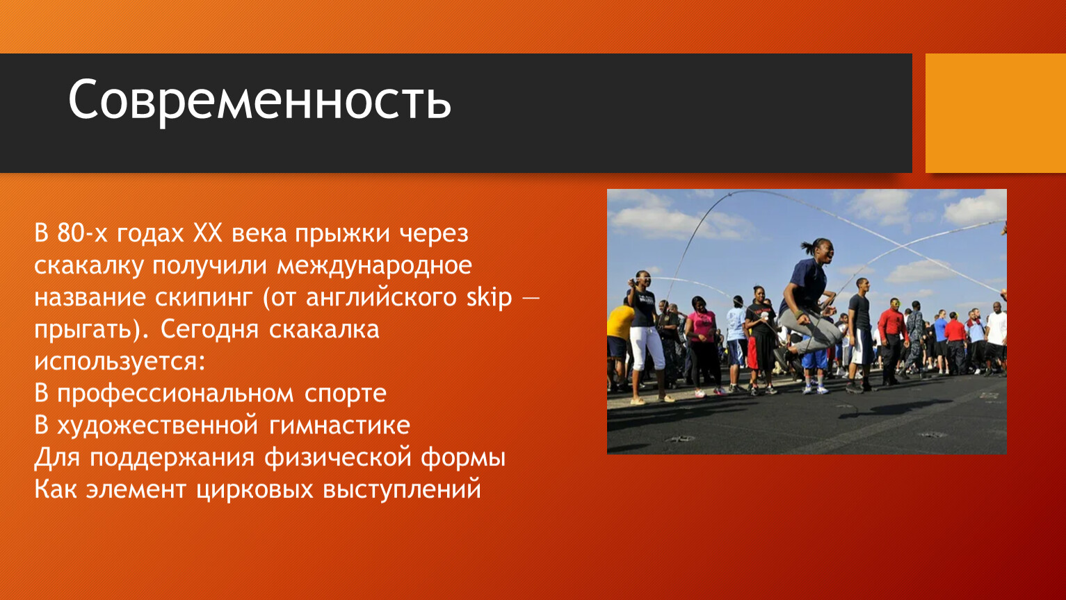 В 80-х годах XX века прыжки через скакалку получили международное название скипинг (от английского skip — прыгать). Сегодня скакалка используется: