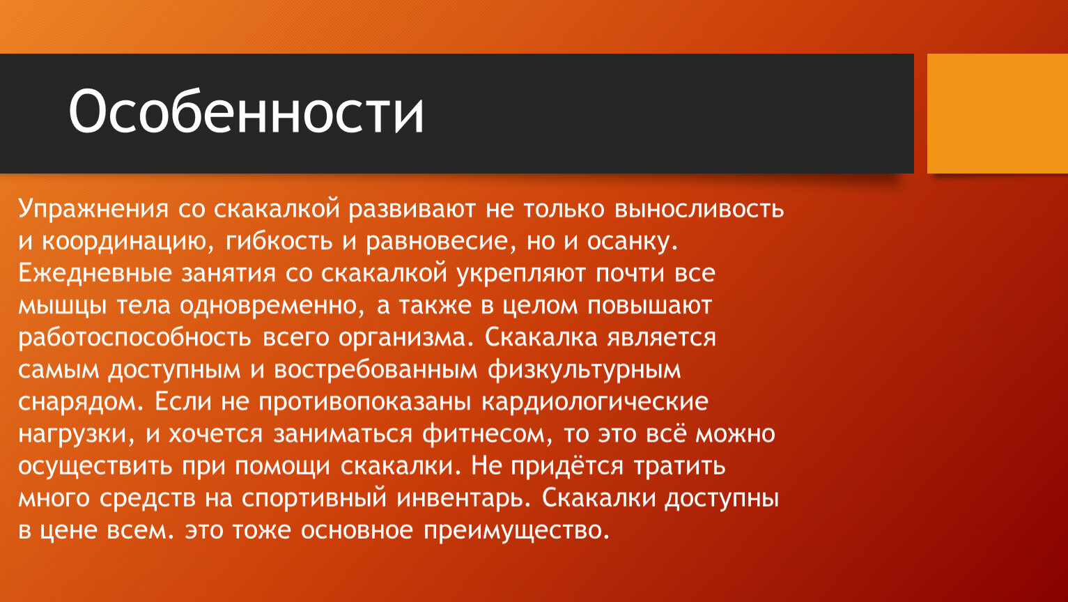 Упражнения со скакалкой развивают не только выносливость и координацию, гибкость и равновесие, но и осанку. Ежедневные занятия со скакалкой укрепляют почти все мышцы тела одновременно, а также в целом повышают работоспособность всего организма. Скакалка является самым доступным и востребованным физкультурным снарядом. Если не противопоказаны кардиологические нагрузки, и хочется заниматься фитнесом, то это всё можно осуществить при помощи скакалки. Не придётся тратить много средств на спортивный инвентарь. Скакалки доступны в цене всем. это тоже основное преимущество.