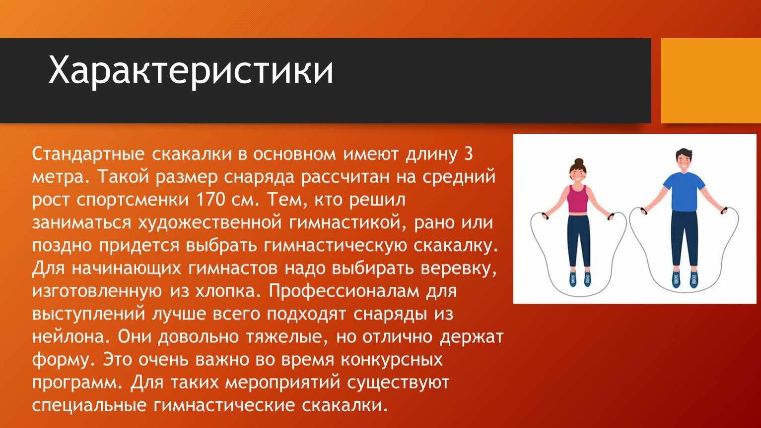 Стандартные скакалки в основном имеют длину 3 метра. Такой размер снаряда рассчитан на средний рост спортсменки 170 см. Тем, кто решил заниматься художественной гимнастикой, рано или поздно придется выбрать гимнастическую скакалку. Для начинающих гимнастов надо выбирать веревку, изготовленную из хлопка. Профессионалам для выступлений лучше всего подходят снаряды из нейлона. Они довольно тяжелые, но отлично держат форму. Это очень важно во время конкурсных программ. Для таких мероприятий существуют специальные гимнастические скакалки.