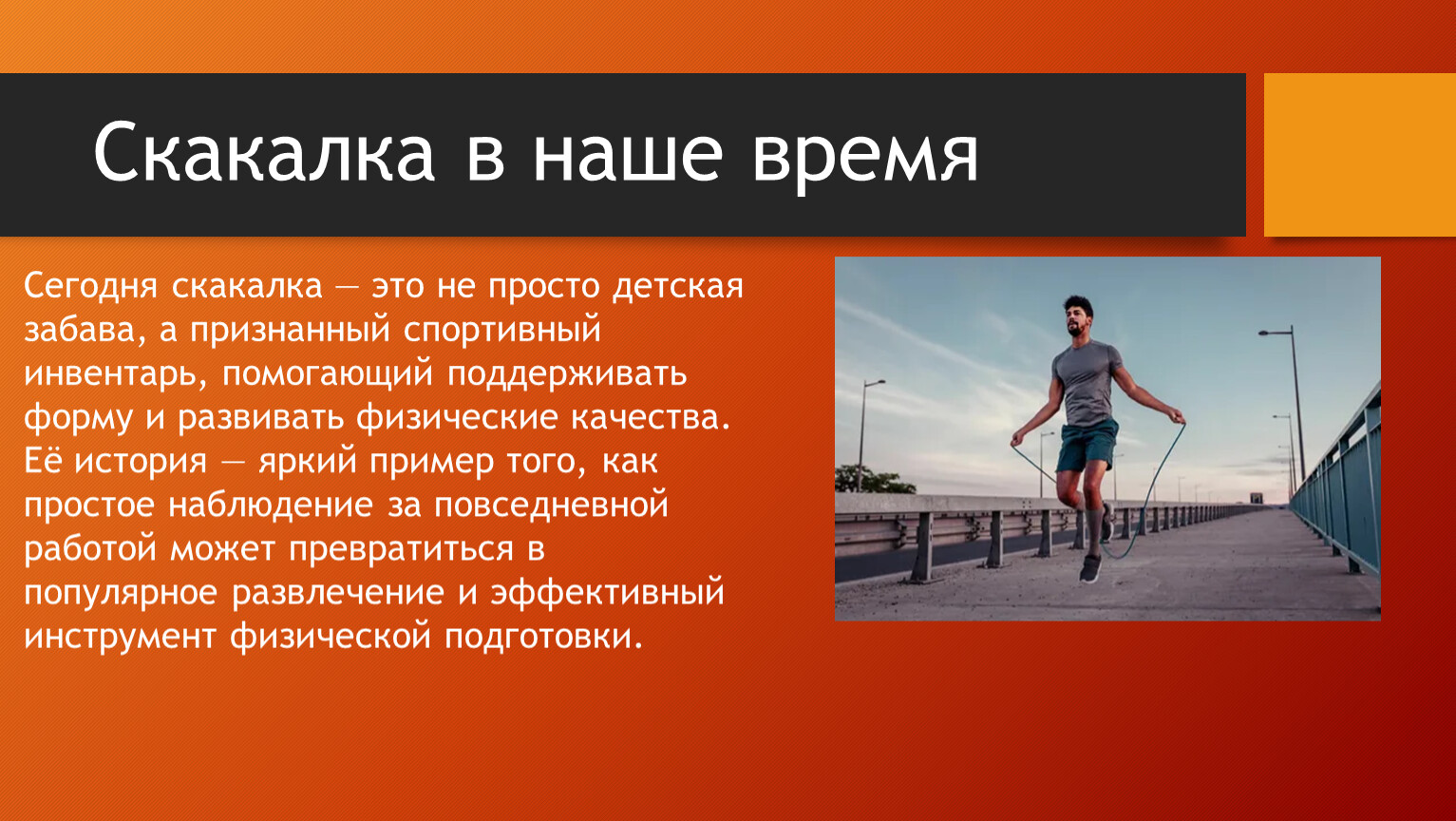 Сегодня скакалка — это не просто детская забава, а признанный спортивный инвентарь, помогающий поддерживать форму и развивать физические качества. Её история — яркий пример того, как простое наблюдение за повседневной работой может превратиться в популярное развлечение и эффективный инструмент физической подготовки.