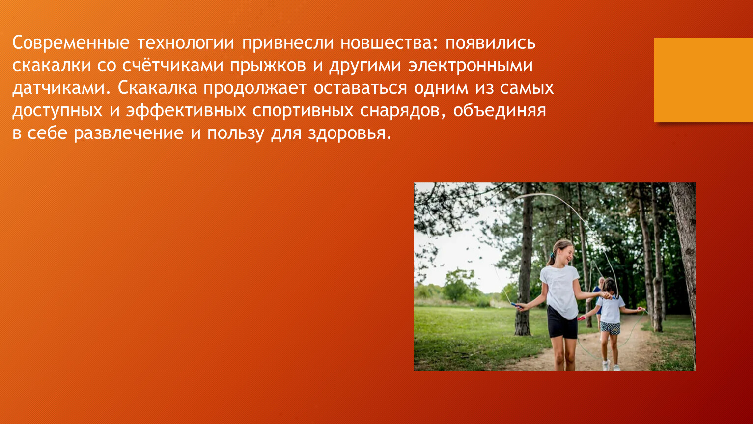 Современные технологии привнесли новшества: появились скакалки со счётчиками прыжков и другими электронными датчиками. Скакалка продолжает оставаться одним из самых доступных и эффективных спортивных снарядов, объединяя в себе развлечение и пользу для здоровья.