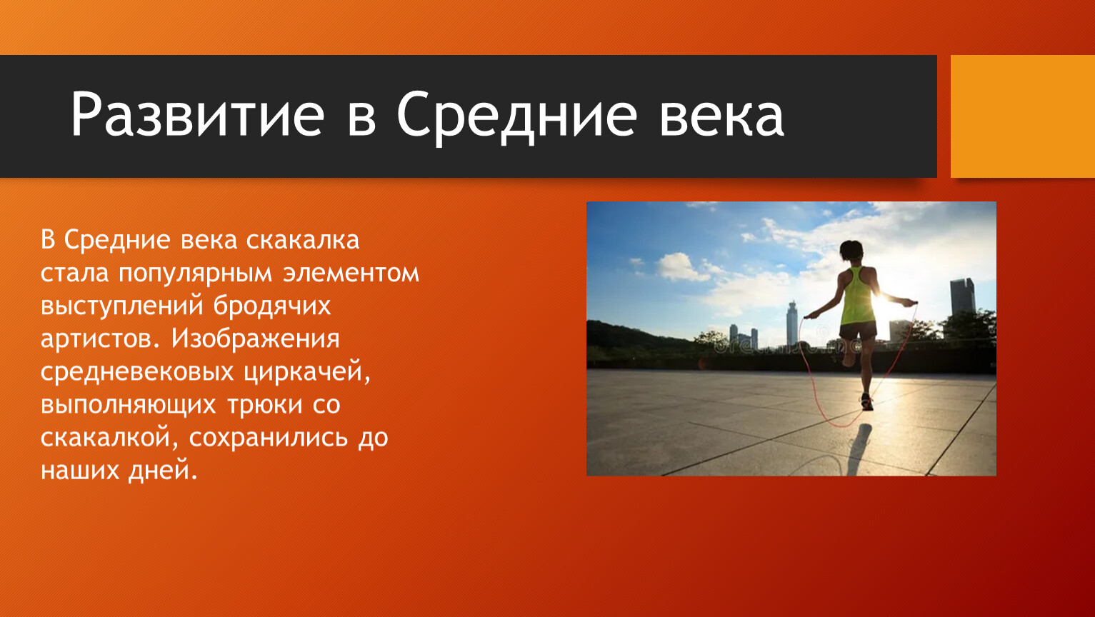 В Средние века скакалка стала популярным элементом выступлений бродячих артистов. Изображения средневековых циркачей, выполняющих трюки со скакалкой, сохранились до наших дней.