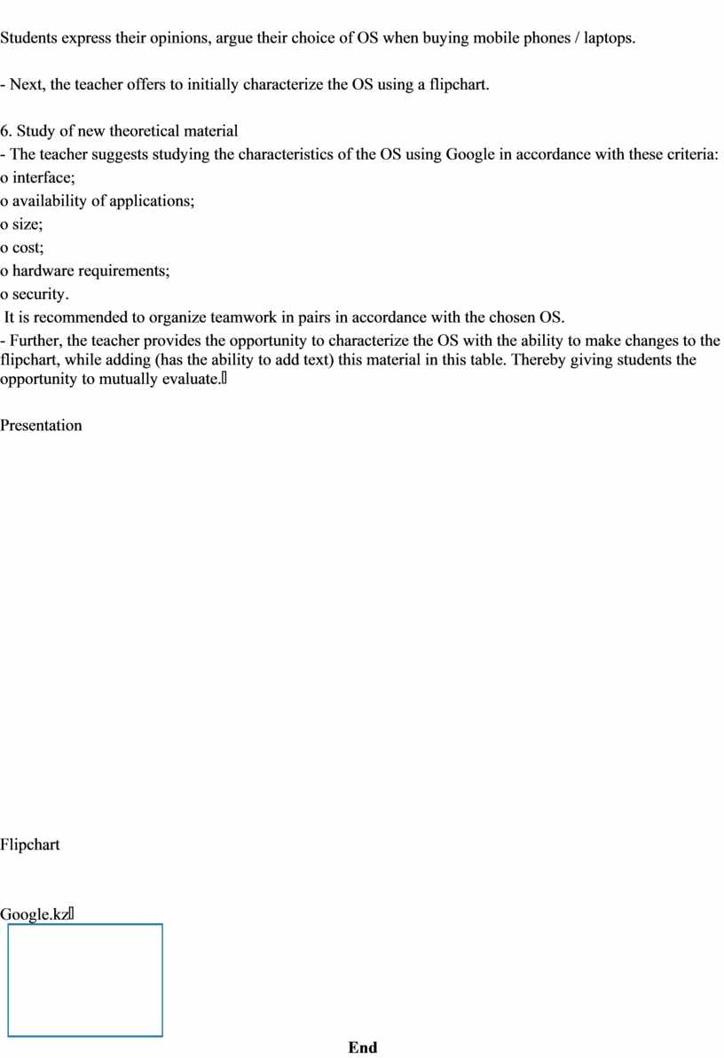 6. Study of new theoretical material - The teacher suggests studying the characteristics of the OS using Google in accordance with these criteria: o interface; o availability of applications; o size; o cost; o hardware requirements; o security. It is recommended to organize teamwork in pairs in accordance with the chosen OS. - Further, the teacher provides the opportunity to characterize the OS with the ability to make changes to the flipchart, while adding (has the ability to add text) this material in this table. Thereby giving students the opportunity to mutually evaluate. |