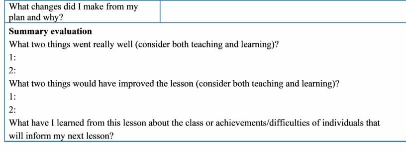 Summary evaluation What two things went really well (consider both teaching and learning)? 1: 2: What two things would have improved the lesson (consider both teaching and learning)? 1: 2: What have I learned from this lesson about the class or achievements/difficulties of individuals that will inform my next lesson? |