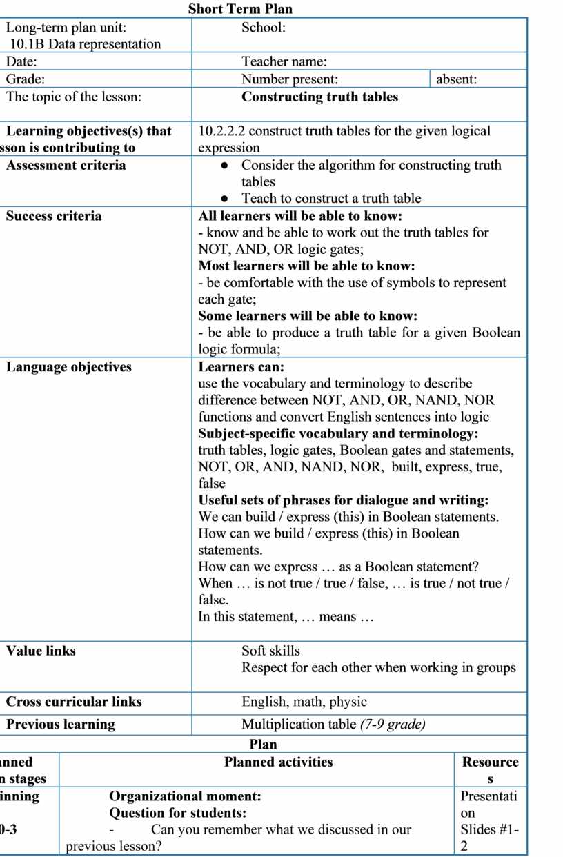 Theory Teacher offers to formulate definition of truth tables. After learners’ answers display definition of truth tables. Learners answer questions and then write definition(s) in copybook Teacher offers to specify the order of logical operations. After learners’ answers show correct answer. Teacher explains an algorithm for constructing the truth table Teacher offers to carry out tasks fill in the truth table of a logical expression: 1) ¬ (А ˄ В) 2) А ˅ ¬ В ˅ С Work in pairs. Teacher offers to carry out tasks find the meaning of expressions followed by self-assessment: 1) 1 AND (0 OR NOT 0) = 2) NOT (0 OR 1) AND 1 = For self-assessment teacher demonstrates correct answer 1) 1 AND (0 OR NOT 0) = 1*(0+1) = 1 2) NOT (0 OR 1) AND 1 = 0*1= 0 Formative assessment Teacher offers to carry out tasks followed self-assessment. For self-assessment teacher demonstrates correct answer.