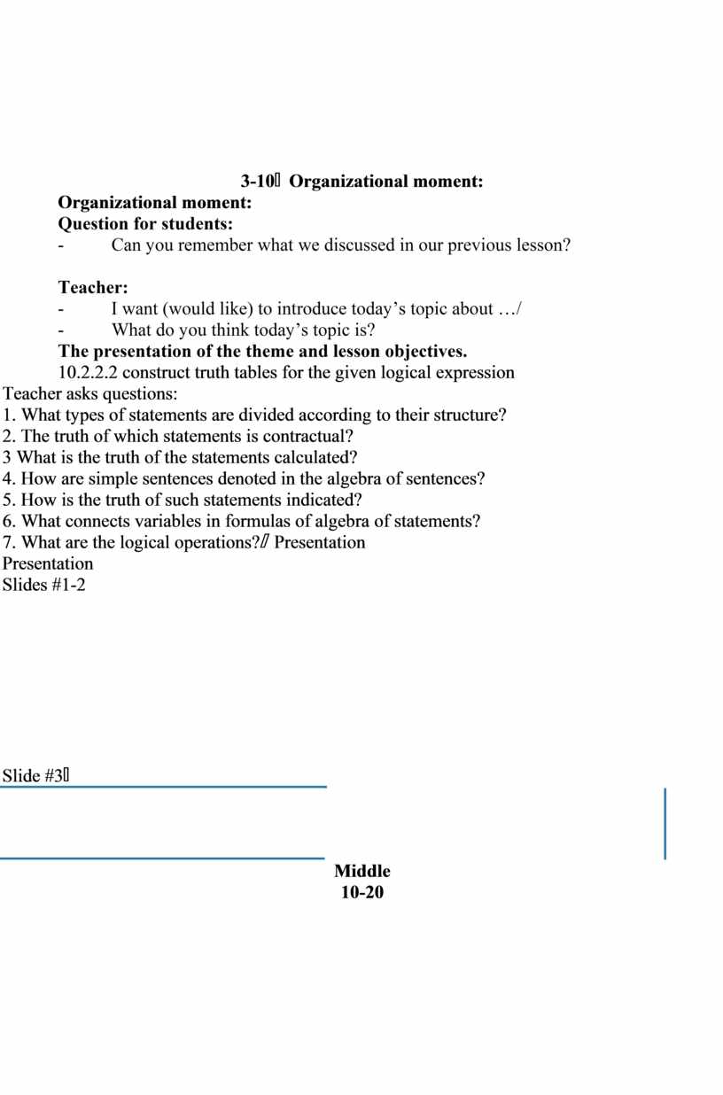 Teacher: - I want (would like) to introduce today’s topic about …/ - What do you think today’s topic is? The presentation of the theme and lesson objectives. 10.2.2.2 construct truth tables for the given logical expression Teacher asks questions: 1. What types of statements are divided according to their structure? 2. The truth of which statements is contractual? 3 What is the truth of the statements calculated? 4. How are simple sentences denoted in the algebra of sentences? 5. How is the truth of such statements indicated? 6. What connects variables in formulas of algebra of statements? 7. What are the logical operations? |