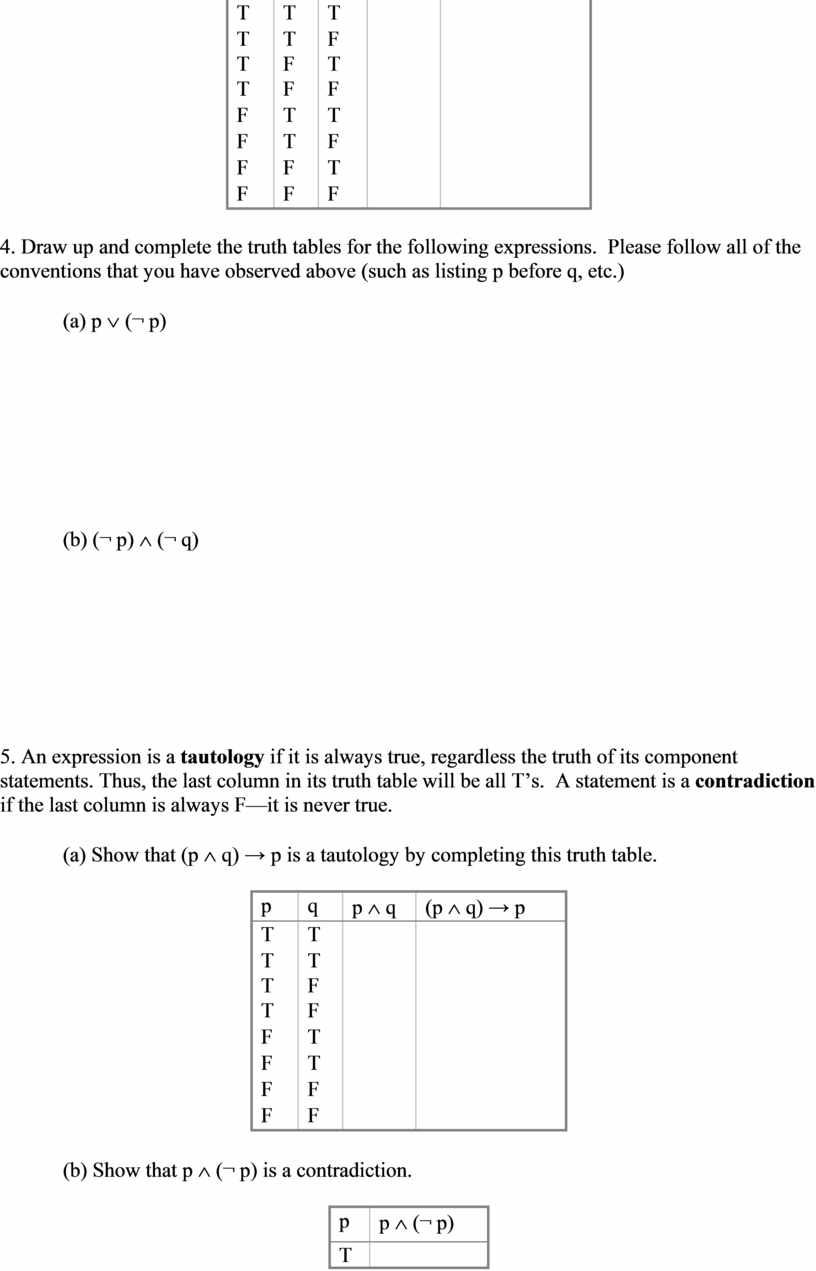 5. An expression is a tautology if it is always true, regardless the truth of its component statements. Thus, the last column in its truth table will be all T’s. A statement is a contradiction if the last column is always F—it is never true.