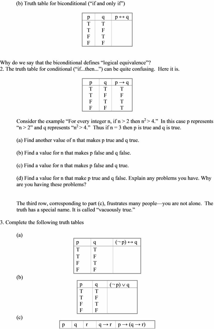 The third row, corresponding to part (c), frustrates many people—you are not alone. The truth has a special name. It is called “vacuously true.”
