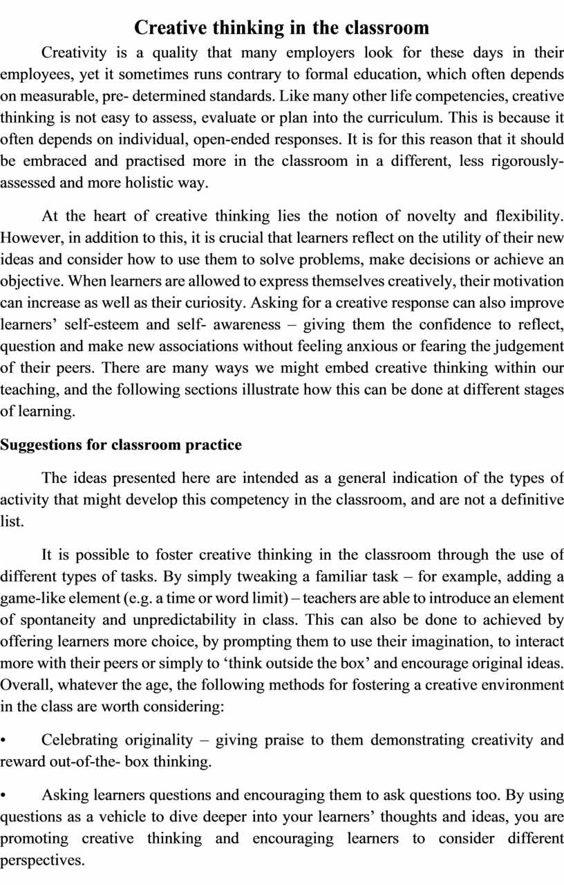 Creativity is a quality that many employers look for these days in their employees, yet it sometimes runs contrary to formal education, which often depends on measurable, pre- determined standards. Like many other life competencies, creative thinking is not easy to assess, evaluate or plan into the curriculum. This is because it often depends on individual, open-ended responses. It is for this reason that it should be embraced and practised more in the classroom in a different, less rigorously-assessed and more holistic way.