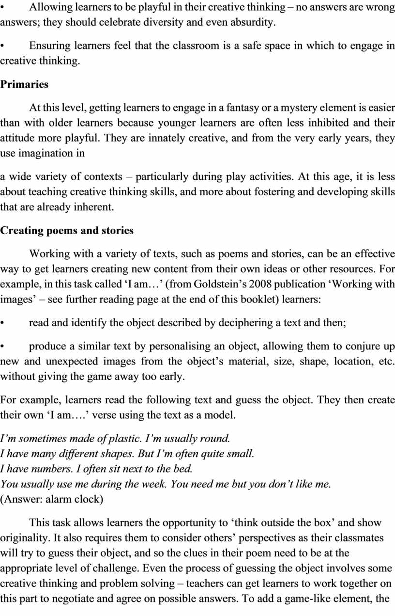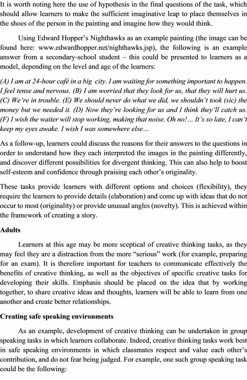 As an example, development of creative thinking can be undertaken in group speaking tasks in which learners collaborate. Indeed, creative thinking tasks work best in safe speaking environments in which classmates respect and value each other’s contribution, and do not fear being judged. For example, one such group speaking task could be the following: