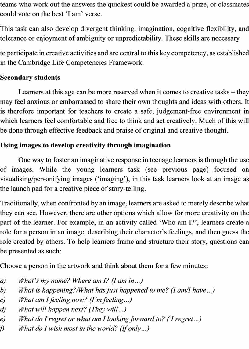 Learners at this age may be more sceptical of creative thinking tasks, as they may feel they are a distraction from the more “serious” work (for example, preparing for an exam). It is therefore important for teachers to communicate effectively the benefits of creative thinking, as well as the objectives of specific creative tasks for developing their skills. Emphasis should be placed on the idea that by working together, to share creative ideas and thoughts, learners will be able to learn from one another and create better relationships.
