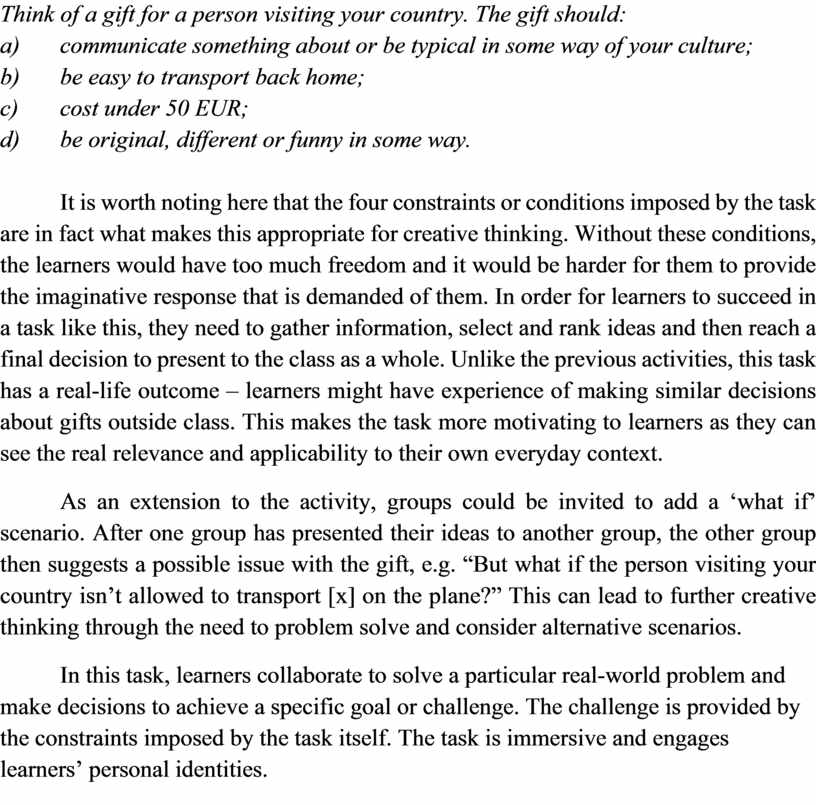It is worth noting here that the four constraints or conditions imposed by the task are in fact what makes this appropriate for creative thinking. Without these conditions, the learners would have too much freedom and it would be harder for them to provide the imaginative response that is demanded of them. In order for learners to succeed in a task like this, they need to gather information, select and rank ideas and then reach a final decision to present to the class as a whole. Unlike the previous activities, this task has a real-life outcome – learners might have experience of making similar decisions about gifts outside class. This makes the task more motivating to learners as they can see the real relevance and applicability to their own everyday context.