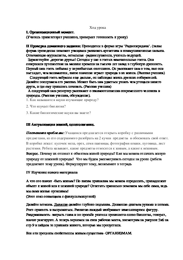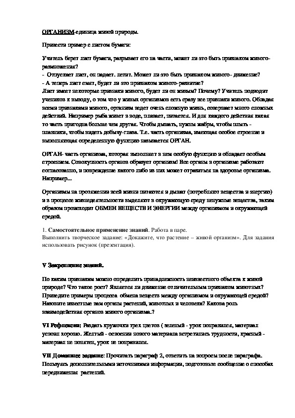 учеников к выводу, о том что у живых организмов есть сразу все признаки живого. Обладая