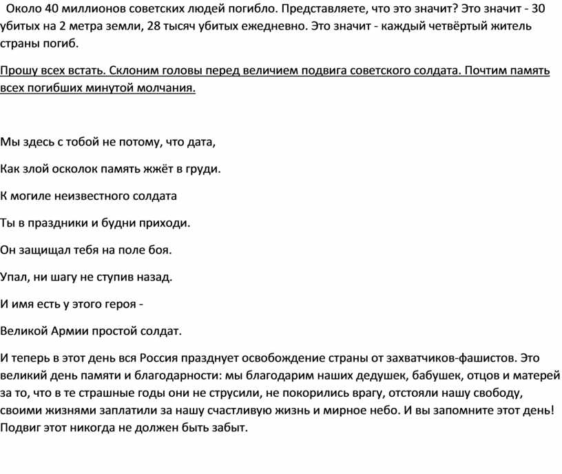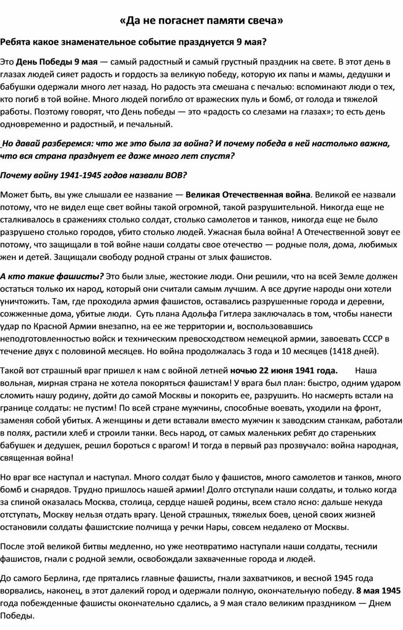И теперь в этот день вся Россия празднует освобождение страны от захватчиков-фашистов. Это великий день памяти и благодарности: мы благодарим наших дедушек, бабушек, отцов и матерей за то, что в те страшные годы они не струсили, не покорились врагу, отстояли нашу свободу, своими жизнями заплатили за нашу счастливую жизнь и мирное небо. И вы запомните этот день! Подвиг этот никогда не должен быть забыт.