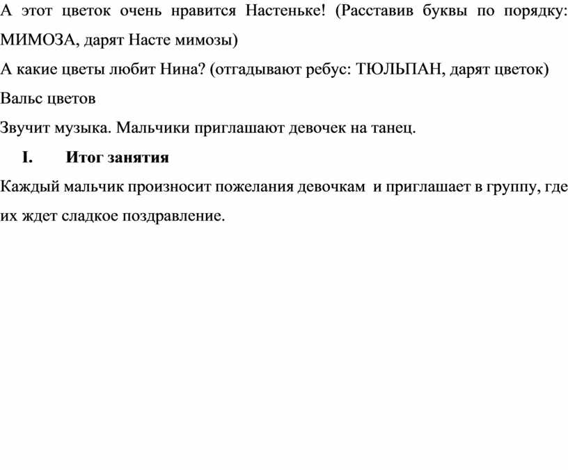 А этот цветок очень нравится Настеньке! (Расставив буквы по порядку: МИМОЗА, дарят Насте мимозы)