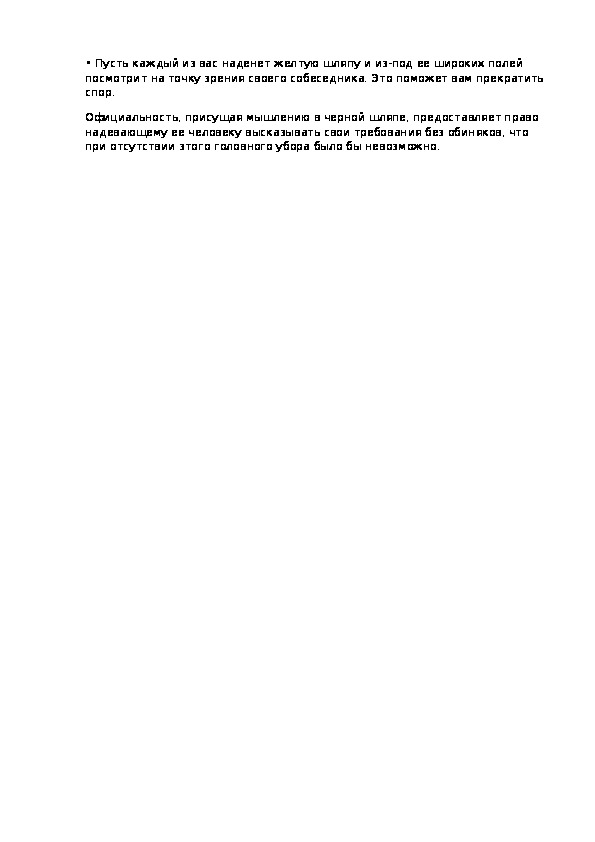 • Проявите благоразумие, прекратите спор.• Пусть каждый из вас наденет желтую шляпу и из-под ее широких полей