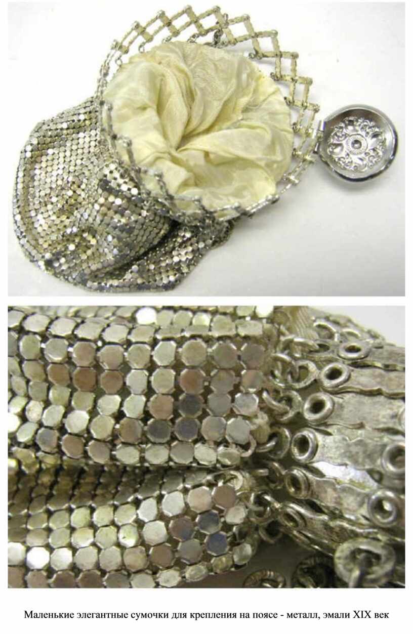 В Россию такие изящные сумочки попали лишь в XVIII столетии. Их привозили из Европы, т.к. своего налаженного производства таких элегантных вещичек в России еще не было. Сумочки периода XVIII - начала ХХ веков - это настоящие шедевры ювелирного искусства: мастера постарались превзойти самих себя, создавая настоящие шедевры, украшенные золотой вышивкой, чеканкой, драгоценными камнями, эмалями, бисером. Это были и вязаные, плетеные из стальной, серебряной (иногда и из золотой) проволоки сумочки-кисеты или же ридикюли (от французского reticule); и жесткие сумочки-коробочки с теснением на цепочках с туалетными принадлежностями внутри; и мягкие сумочки с пестрой вышивкой бисером для менее богатых дам.