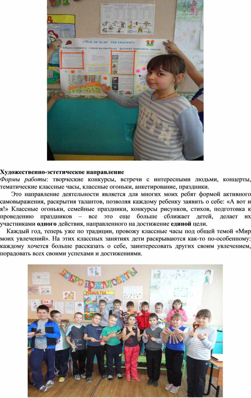 Формы работы: творческие конкурсы, встречи с интересными людьми, концерты, тематические классные часы, классные огоньки, анкетирование, праздники.