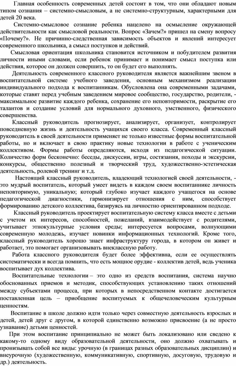 Деятельность современного классного руководителя является важнейшим звеном в воспитательной системе учебного заведения, основным механизмом реализации индивидуального подхода к воспитанникам. Обусловлена она современными задачами, которые ставят перед учебным заведением мировое сообщество, государство, родители, - максимальное развитие каждого ребенка, сохранение его неповторимости, раскрытие его талантов и создание условий для нормального духовного, умственного, физического совершенства.
