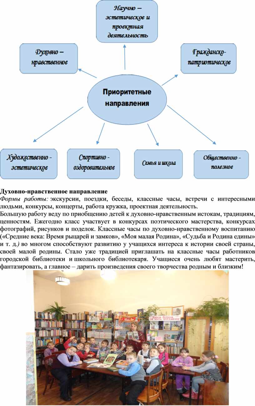 Большую работу веду по приобщению детей к духовно-нравственным истокам, традициям, ценностям. Ежегодно класс участвует в конкурсах поэтического мастерства, конкурсах фотографий, рисунков и поделок. Классные часы по духовно-нравственному воспитанию («Средние века: Время рыцарей и замков», «Моя малая Родина», «Судьба и Родина едины» и т. д.) во многом способствуют развитию у учащихся интереса к истории своей страны, своей малой родины. Стало уже традицией приглашать на классные часы работников городской библиотеки и школьного библиотекаря. Учащиеся очень любят мастерить, фантазировать, а главное – дарить произведения своего творчества родным и близким!