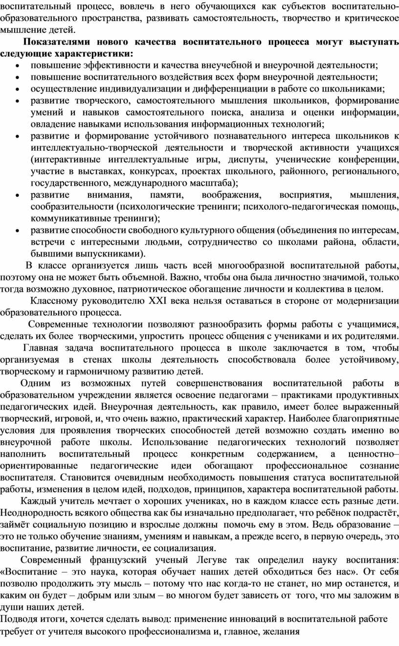 Следует отметить, что применение инноваций в воспитательной работе требует от классного руководителя высокого профессионализма и, главное, желания совершенствоваться в изучении и внедрении инновационных технологий в свою деятельность.