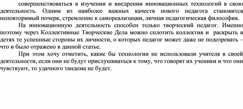 На инновационную деятельность способен только творческий педагог. Именно поэтому через Коллективные Творческие Дела можно сплотить коллектив и раскрыть в детях те успешные стороны их личности, о которых педагог может даже не подозревать – что и было отражено в данной статье.