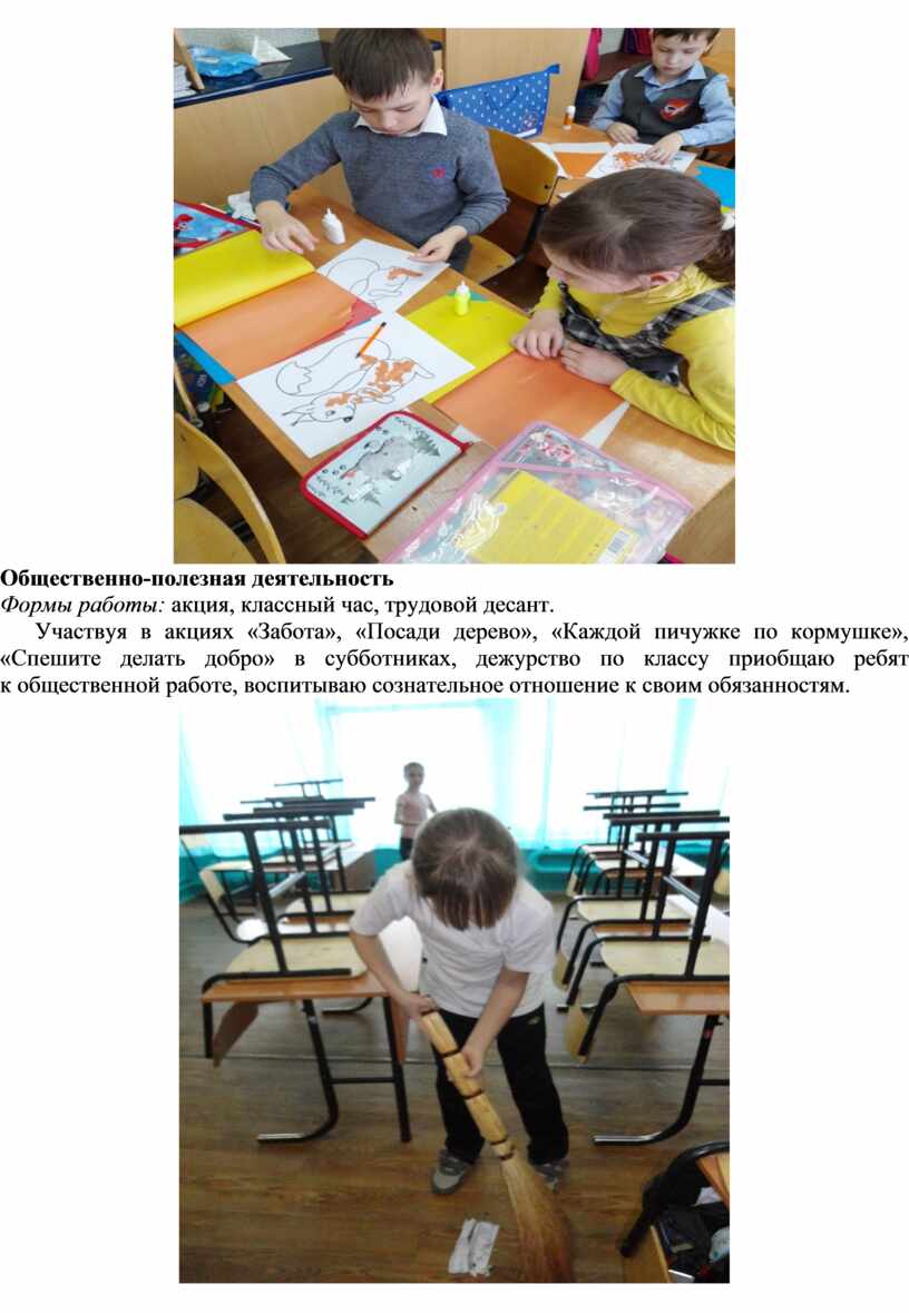 Участвуя в акциях «Забота», «Посади дерево», «Каждой пичужке по кормушке», «Спешите делать добро» в субботниках, дежурство по классу приобщаю ребят к общественной работе, воспитываю сознательное отношение к своим обязанностям.