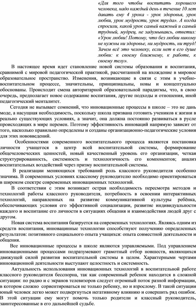 Актуальность использования инновационных технологий в воспитательной работе классного руководителя бесспорна, так как современный ребенок находится в сложной ситуации: по радио и с экранов телевизоров следует огромный поток разной информации, в котором сложно сориентироваться не только ребенку, но и взрослому. В такой ситуации юный человек легко может подвергнуться негативному влиянию и совершить ряд ошибок. В этой ситуации ему могут помочь только родители и классный руководитель, заинтересованные в его дальнейшей судьбе.