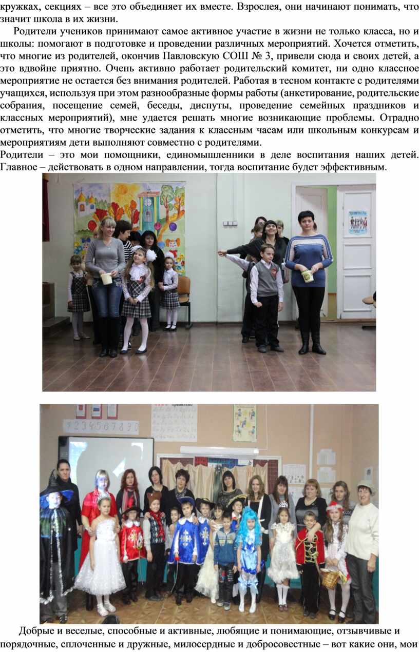 Родители учеников принимают самое активное участие в жизни не только класса, но и школы: помогают в подготовке и проведении различных мероприятий. Хочется отметить, что многие из родителей, окончив Павловскую СОШ № 3, привели сюда и своих детей, а это вдвойне приятно. Очень активно работает родительский комитет, ни одно классное мероприятие не остается без внимания родителей. Работая в тесном контакте с родителями учащихся, используя при этом разнообразные формы работы (анкетирование, родительские собрания, посещение семей, беседы, диспуты, проведение семейных праздников и классных мероприятий), мне удается решать многие возникающие проблемы. Отрадно отметить, что многие творческие задания к классным часам или школьным конкурсам и мероприятиям дети выполняют совместно с родителями.