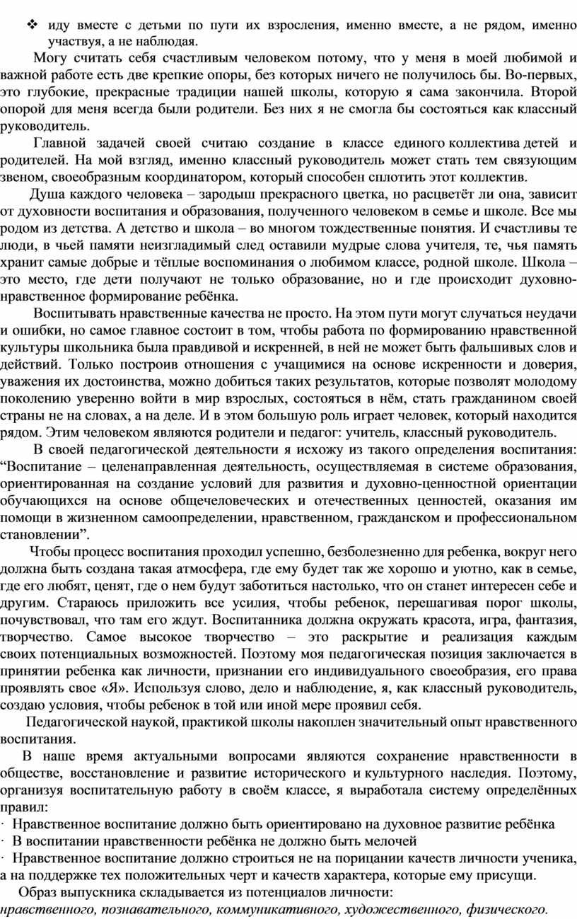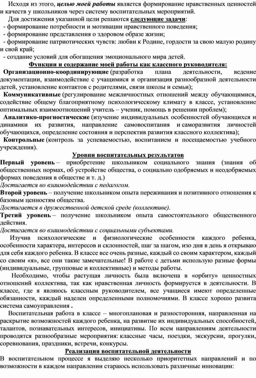 В своей педагогической деятельности я исхожу из такого определения воспитания: “Воспитание – целенаправленная деятельность, осуществляемая в системе образования, ориентированная на создание условий для развития и духовно-ценностной ориентации обучающихся на основе общечеловеческих и отечественных ценностей, оказания им помощи в жизненном самоопределении, нравственном, гражданском и профессиональном становлении”.