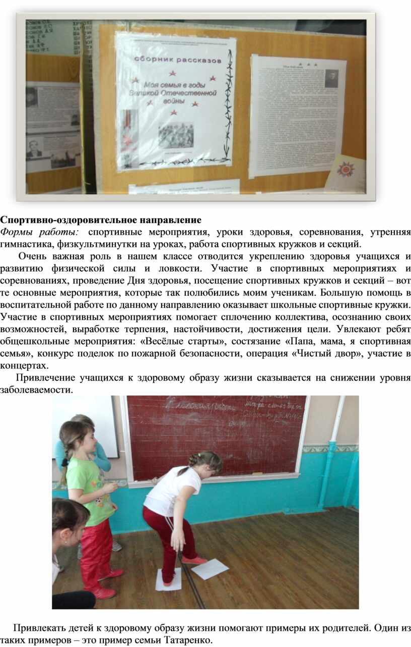 Очень важная роль в нашем классе отводится укреплению здоровья учащихся и развитию физической силы и ловкости. Участие в спортивных мероприятиях и соревнованиях, проведение Дня здоровья, посещение спортивных кружков и секций – вот те основные мероприятия, которые так полюбились моим ученикам. Большую помощь в воспитательной работе по данному направлению оказывает школьные спортивные кружки. Участие в спортивных мероприятиях помогает сплочению коллектива, осознанию своих возможностей, выработке терпения, настойчивости, достижения цели. Увлекают ребят общешкольные мероприятия: «Весёлые старты», состязание «Папа, мама, я спортивная семья», конкурс поделок по пожарной безопасности, операция «Чистый двор», участие в концертах.