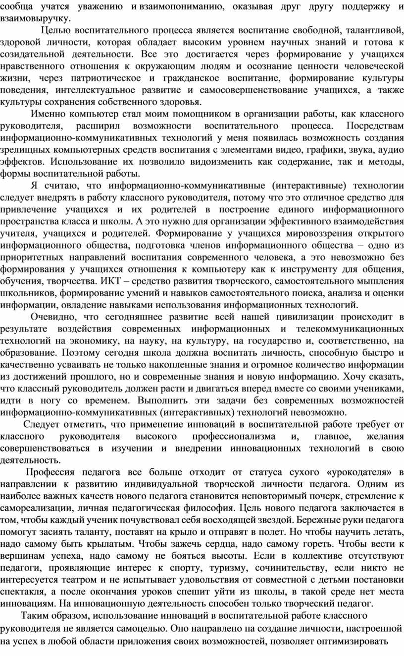 Именно компьютер стал моим помощником в организации работы, как классного руководителя, расширил возможности воспитательного процесса. Посредствам информационно-коммуникативных технологий у меня появилась возможность создания зрелищных компьютерных средств воспитания с элементами видео, графики, звука, аудио эффектов. Использование их позволило видоизменить как содержание, так и методы, формы воспитательной работы.