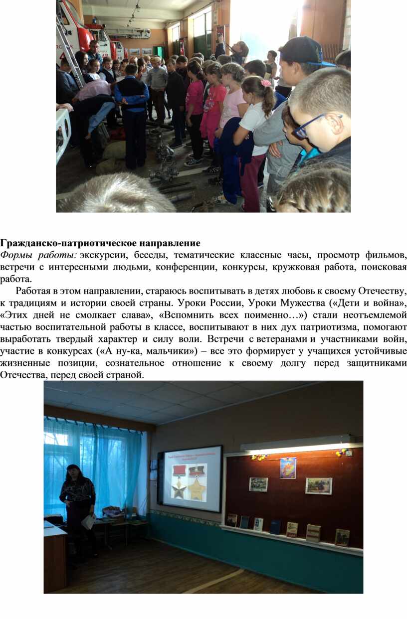 Формы работы: экскурсии, беседы, тематические классные часы, просмотр фильмов, встречи с интересными людьми, конференции, конкурсы, кружковая работа, поисковая работа.