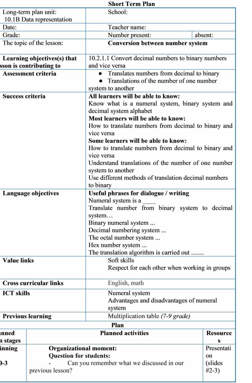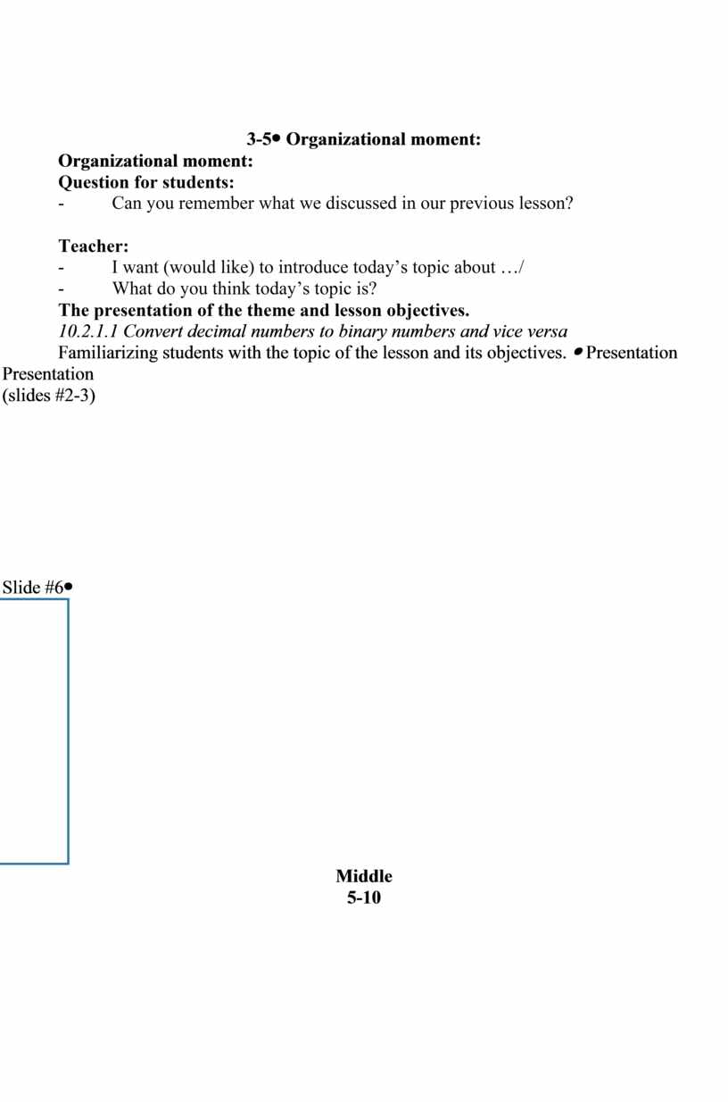 Teacher: - I want (would like) to introduce today’s topic about …/ - What do you think today’s topic is? The presentation of the theme and lesson objectives. 10.2.1.1 Convert decimal numbers to binary numbers and vice versa Familiarizing students with the topic of the lesson and its objectives. |