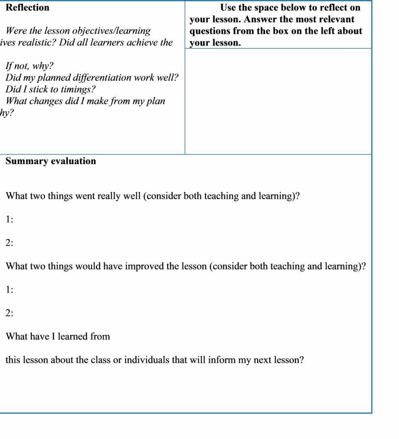 Were the lesson objectives/learning objectives realistic? Did all learners achieve the LO? If not, why? Did my planned differentiation work well? Did I stick to timings? What changes did I make from my plan and why?