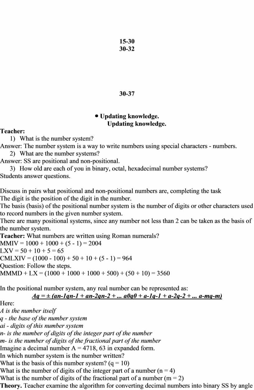 Updating knowledge. Teacher: 1) What is the number system? Answer: The number system is a way to write numbers using special characters - numbers. 2) What are the number systems? Answer: SS are positional and non-positional. 3) How old are each of you in binary, octal, hexadecimal number systems? Students answer questions.