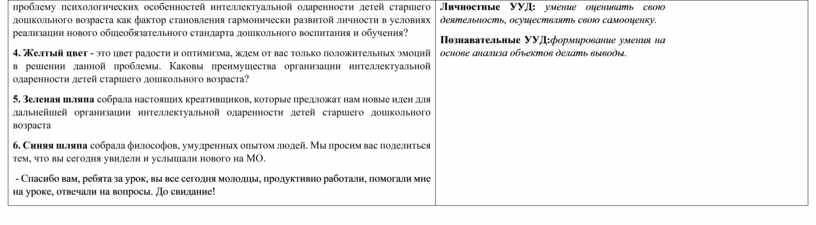 Итак, наш урок подходит к концу. - Ребята, что вы узнали об именах существительных в дательном падеже? (Отвечают на вопросы кому? чему?, употребляются с предлогами к, по.) - Чему научились? (Научились находить имена существительные в дательном падеже, определять падеж имен существительных.) - Сейчас я хочу, чтобы вы оценили свою работу. Учебная ситуация: Выбора Предлагаю вам представить себя на месте братьев и "примерить" одну из шляп. Подойдите, пожалуйста, по одному человеку из каждой подгруппы и выберите шляпу. 1. Участников с белой шляпой попрошу поделиться, какой информацией о психологических особенностях интеллектуальной одаренности детей старшего дошкольного возраста вы обладаете. Коротко, только факты. 2. Группу красных шляп просим поделиться своими чувствами и эмоциями, которые возникают у вас, когда вы слышите понятие психологические особенности интеллектуальной одаренности детей старшего дошкольного возраста? 3. От группы черных шляп жду критический взгляд на проблему психологических особенностей интеллектуальной одаренности детей старшего дошкольного возраста как фактор становления гармонически развитой личности в условиях реализации нового общеобязательного стандарта дошкольного воспитания и обучения? 4. Желтый цвет - это цвет радости и оптимизма, ждем от вас только положительных эмоций в решении данной проблемы. Каковы преимущества организации интеллектуальной одаренности детей старшего дошкольного возраста? 5. Зеленая шляпа собрала настоящих креативщиков, которые предложат нам новые идеи для дальнейшей организации интеллектуальной одаренности детей старшего дошкольного возраста 6. Синяя шляпа собрала философов, умудренных опытом людей. Мы просим вас поделиться тем, что вы сегодня увидели и услышали нового на МО. - Спасибо вам, ребята за урок, вы все сегодня молодцы, продуктивно работали, помогали мне на уроке, отвечали на вопросы. До свидание! |