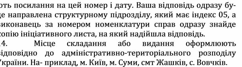 14. Місце складання або видання оформлюють відповідно до адміністративно-територіального розподілу України. На- приклад, м. Київ, м. Суми, смт Жашків, с. Вовчкiв.