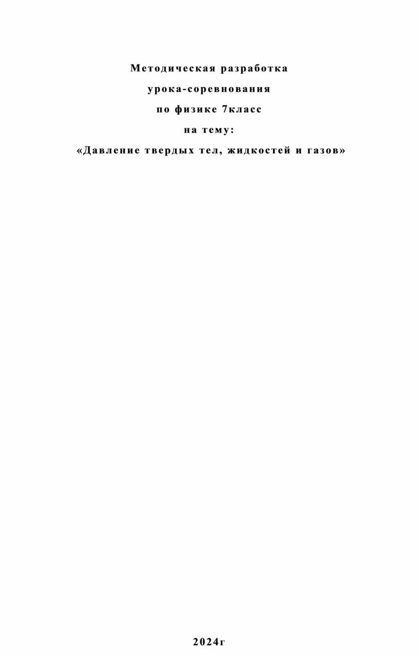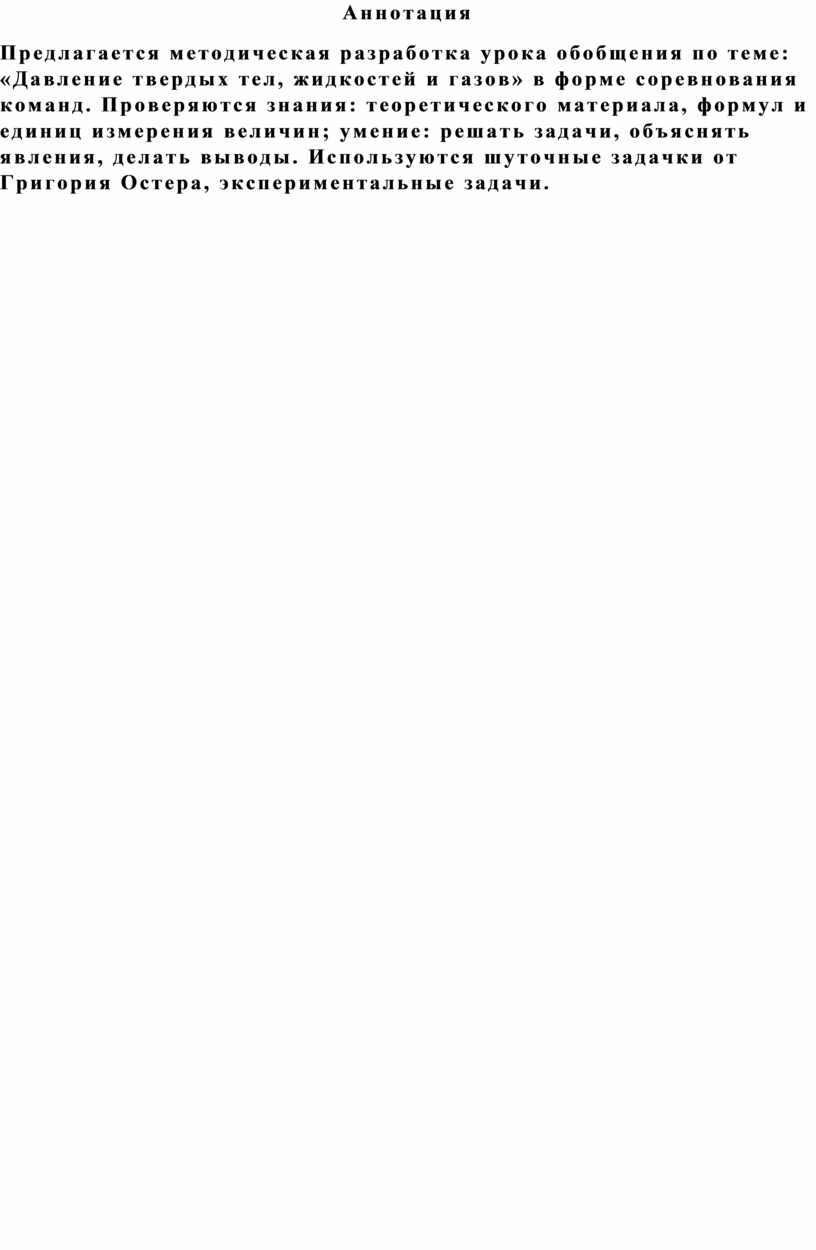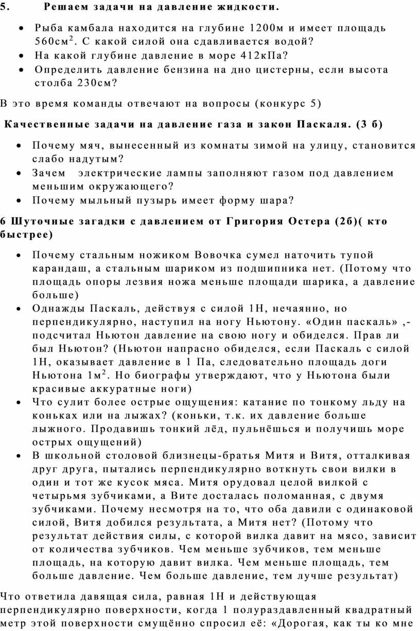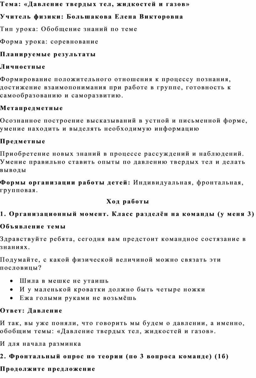 Предлагается методическая разработка урока обобщения по теме: «Давление твердых тел, жидкостей и газов» в форме соревнования команд. Проверяются знания: теоретического материала, формул и единиц измерения величин; умение: решать задачи, объяснять явления, делать выводы. Используются шуточные задачки от Григория Остера, экспериментальные задачи.