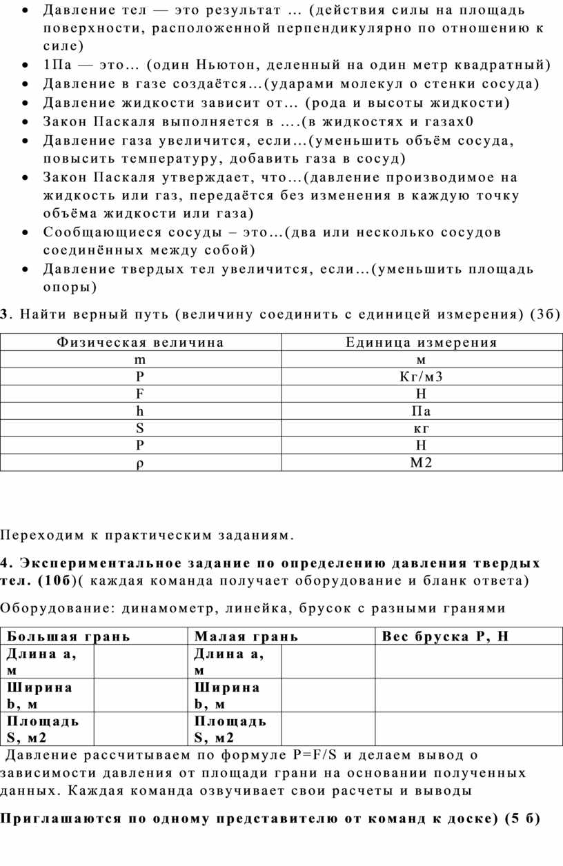 4. Экспериментальное задание по определению давления твердых тел. (10б)( каждая команда получает оборудование и бланк ответа)