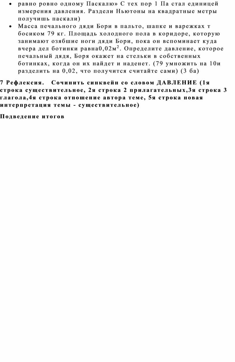 7 Рефлексия. Сочинить синквейн со словом ДАВЛЕНИЕ (1я строка существительное, 2я строка 2 прилагательных,3я строка 3 глагола,4я строка отношение автора теме, 5я строка новая интерпретация темы - существительное)