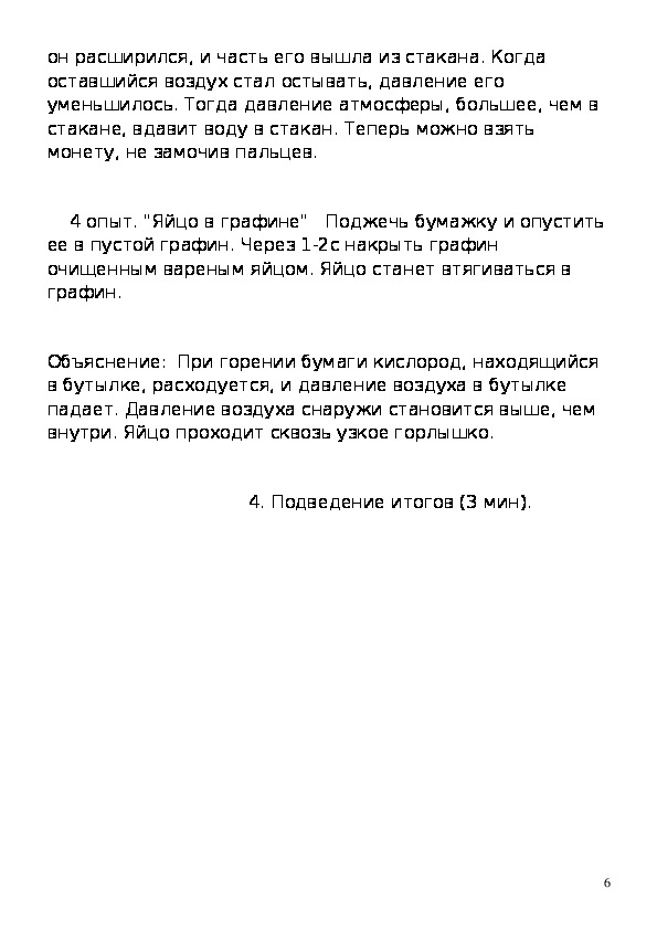 4 опыт. "Яйцо в графине" Поджечь бумажку и опустить