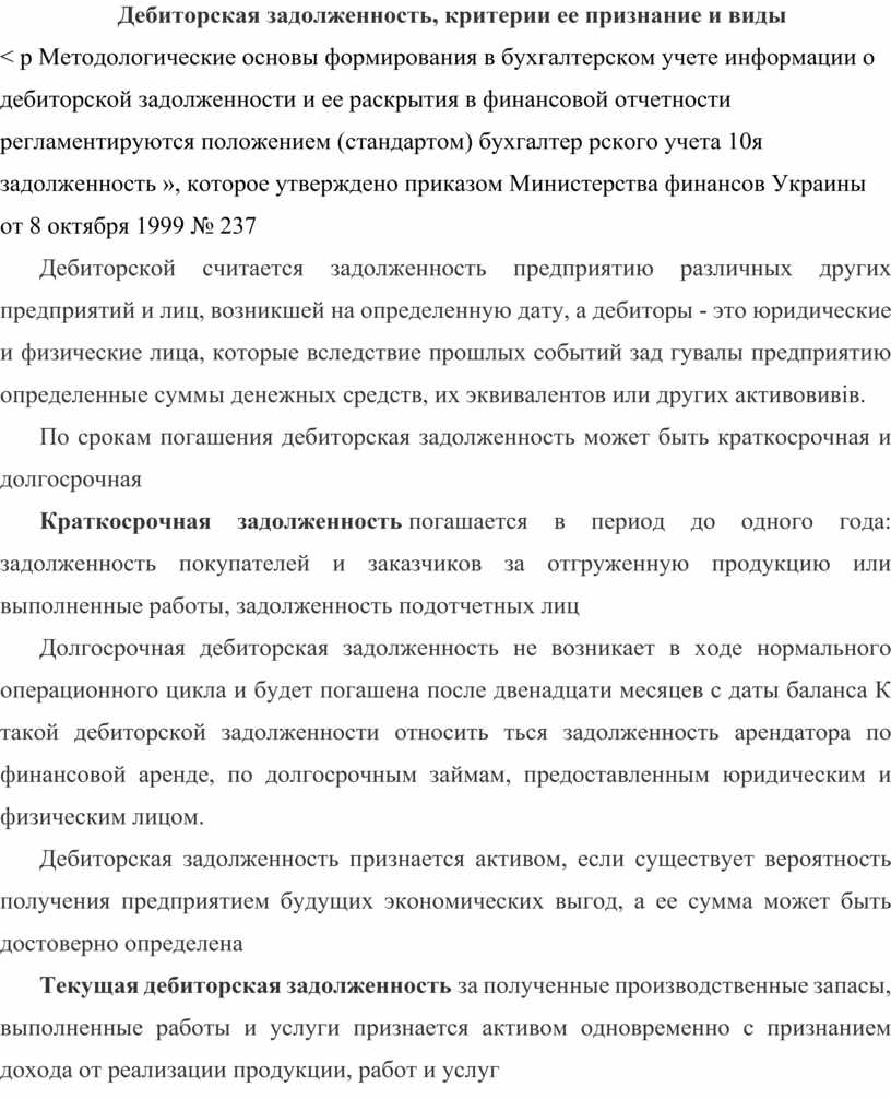 < p Методологические основы формирования в бухгалтерском учете информации о дебиторской задолженности и ее раскрытия в финансовой отчетности регламентируются положением (стандартом) бухгалтер рского учета 10я задолженность », которое утверждено приказом Министерства финансов Украины от 8 октября 1999 № 237