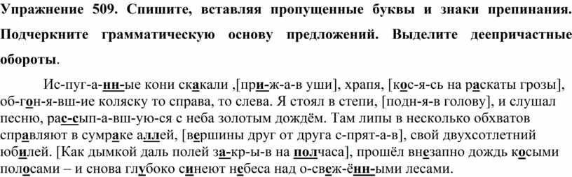Упражнение 509. Спишите, вставляя пропущенные буквы и знаки препинания. Подчеркните грамматическую основу предложений. Выделите деепричастные обороты.