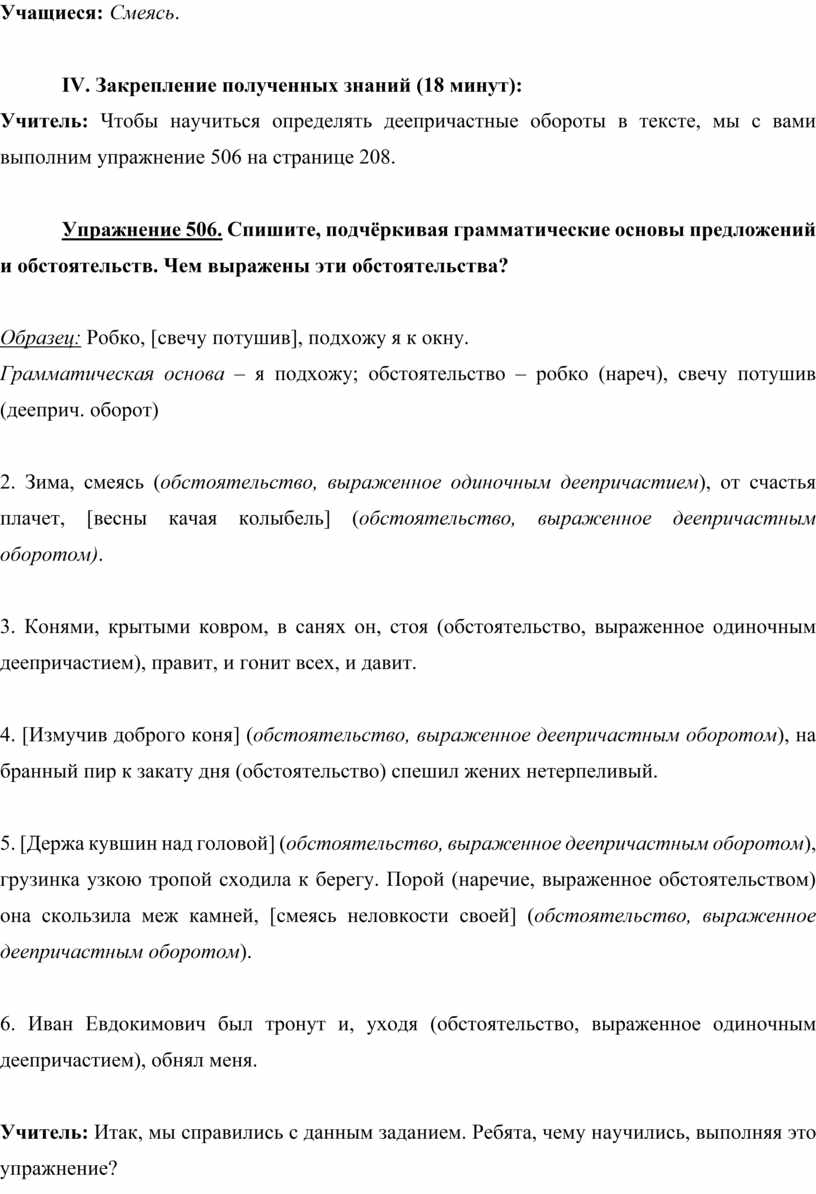 Учитель: Чтобы научиться определять деепричастные обороты в тексте, мы с вами выполним упражнение 506 на странице 208.