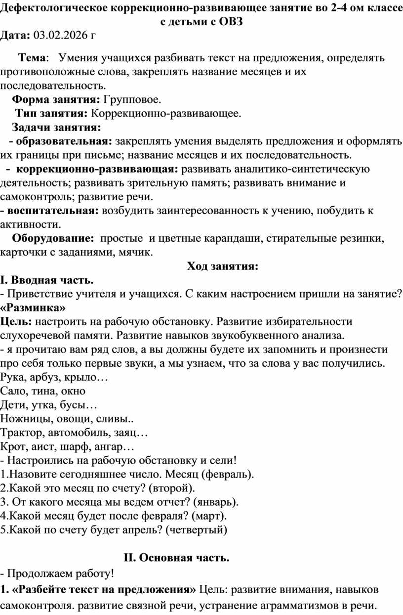 Дефектологическое коррекционно-развивающее занятие во 2-4 ом классе с детьми с ОВЗ